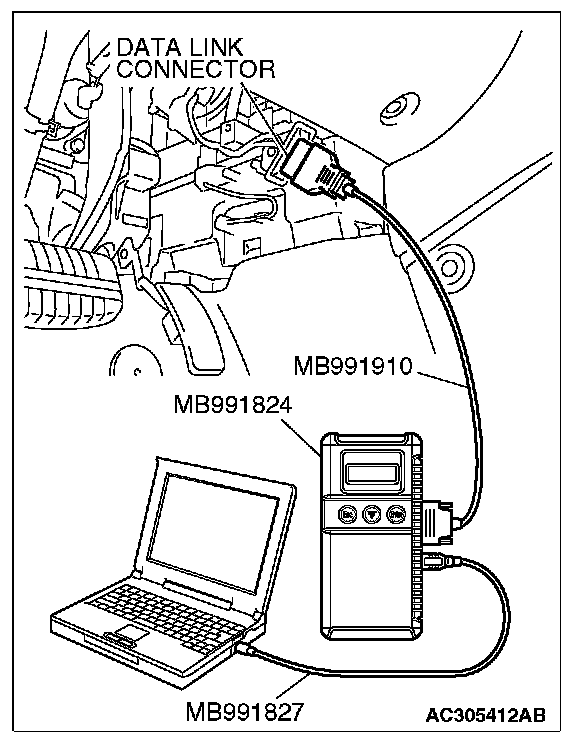 CAUTION: To prevent damage to scan tool MB991958, always turn the ignition switch to the "LOCK" (OFF) position before connecting or disconnecting scan tool MB991958.