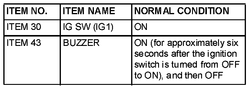 NOTE: Turn the ignition switch from the OFF position to the ON position. Then item No.43 should be ON for approximately six seconds only.