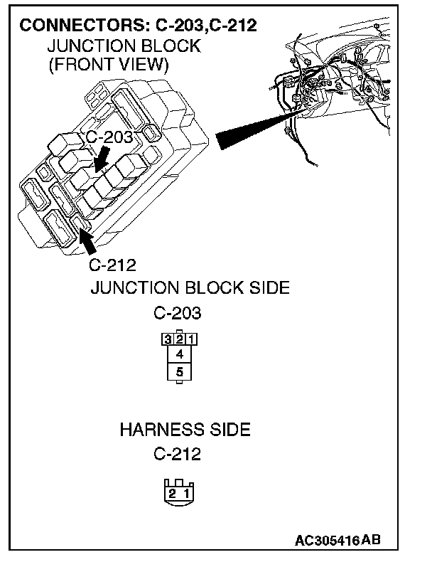 NOTE: Also check junction block connector C-212 for loose, corroded or damaged terminals, or terminals pushed back in the connectors. If junction block connector C-212 is damaged, repair or replace the damaged component(s) as described in Harness Connector Inspection.