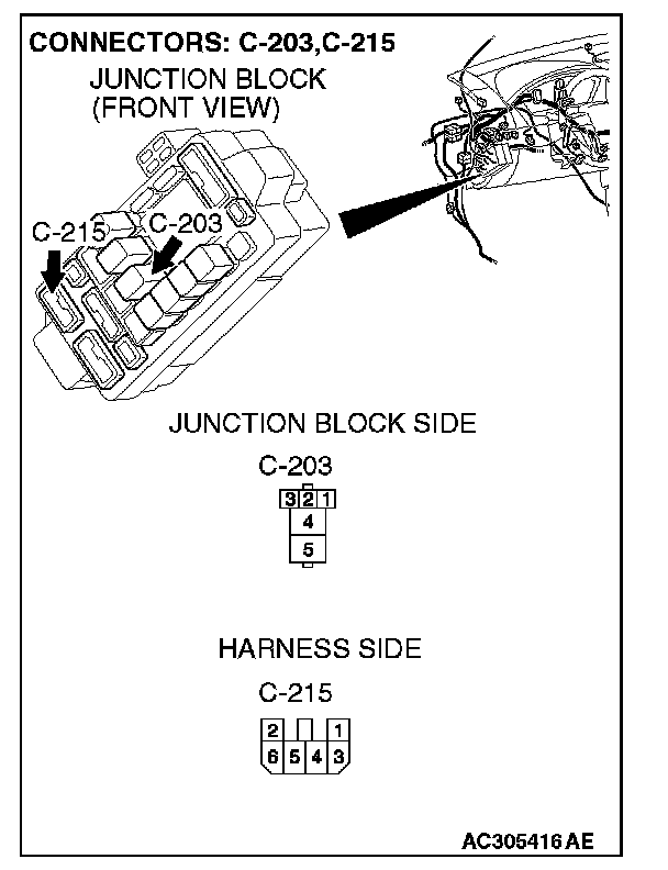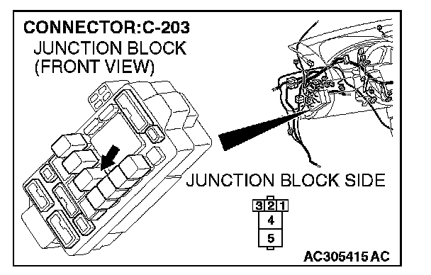 STEP 3. Check power window relay connector C-203 for loose, corroded or damaged terminals, or terminals pushed back in the connector.