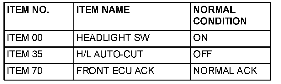 Normal condition is not displayed for "FRONT ECU ACK": Replace the front-ECU. Verify that the headlights (low-beam) illuminate normally.