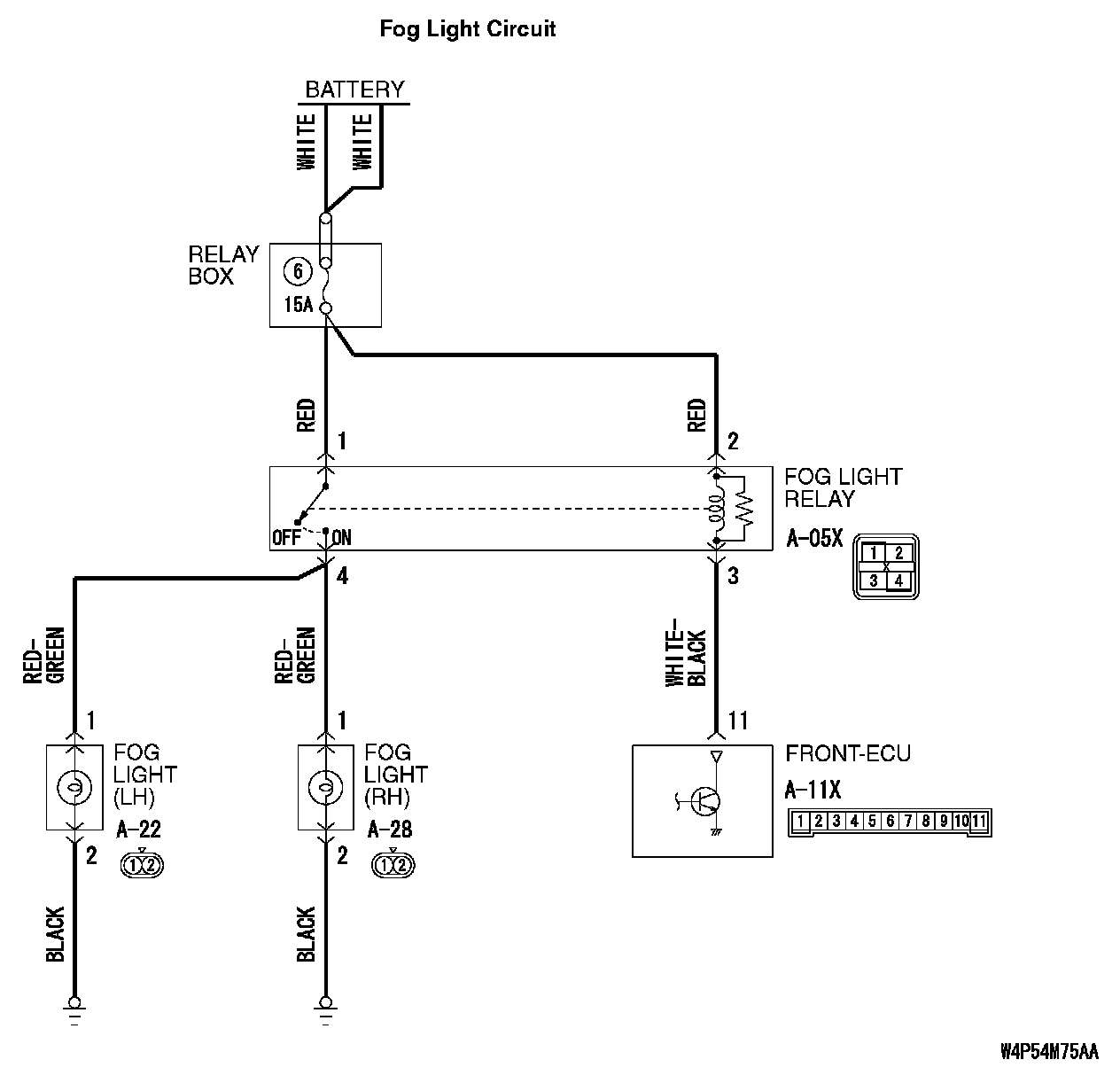 STEP 13. Check the wiring harness between fog light relay connector A-05X (terminal 4) and fog light (RH) connector A-28 (terminal 1).