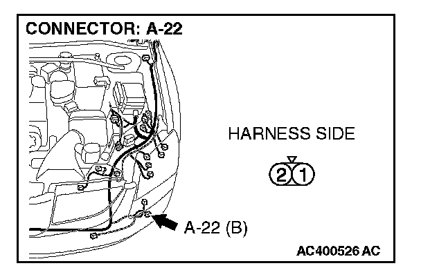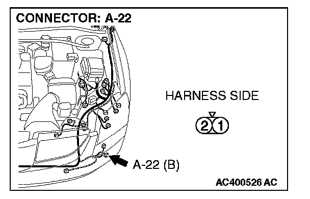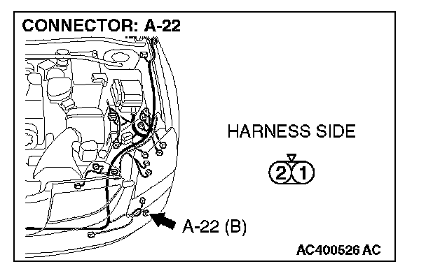 1. Disconnect fog light (LH) connector A-22 and measure the resistance available at the wiring harness side of the connector.