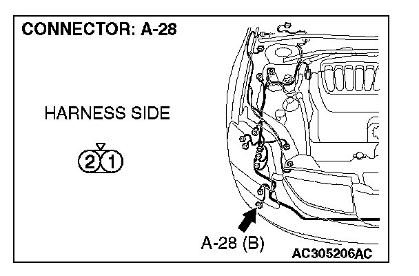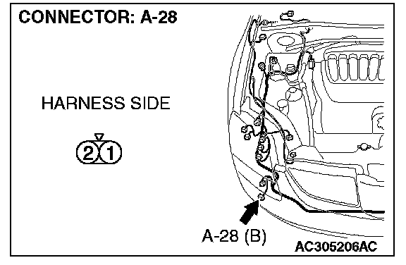 1. Disconnect fog light (RH) connector A-28 and measure the resistance available at the wiring harness side of the connector.
