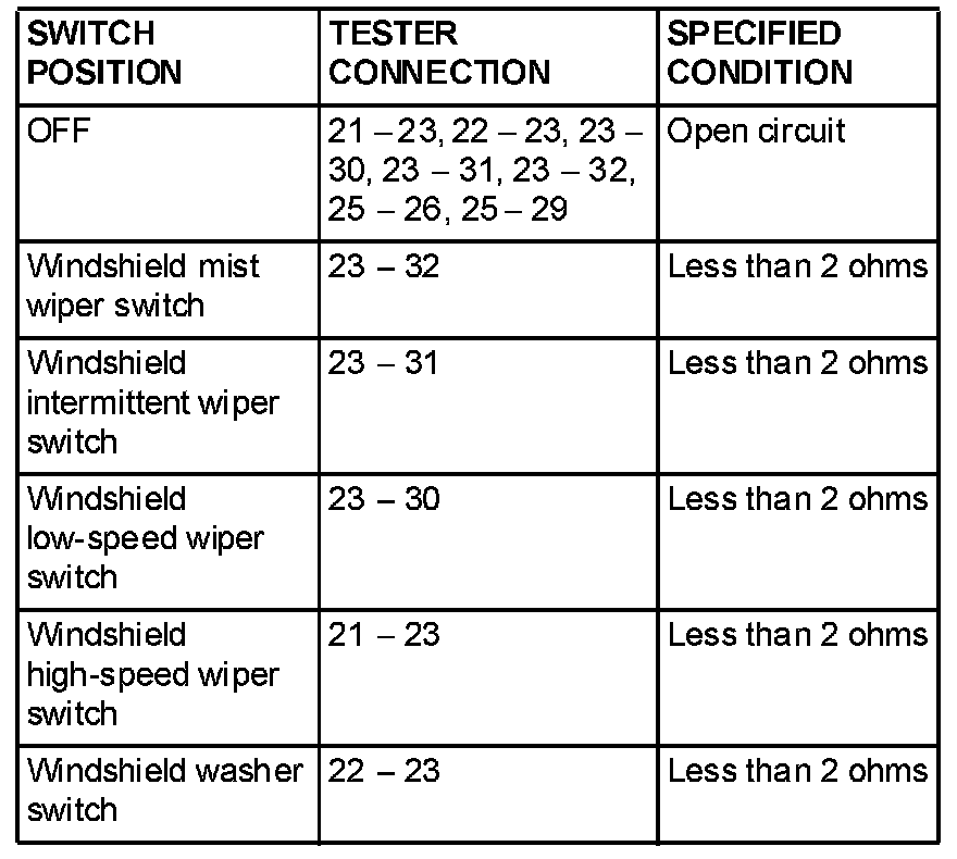 Remove the windshield wiper and washer switch. Then check continuity between the switch terminals.