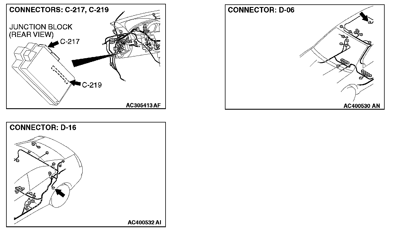 STEP 11. Check the wiring harness between rear door switch (RH) connector D-06 (terminal 1) and ETACS-ECU connector C-217 (terminal 35).
