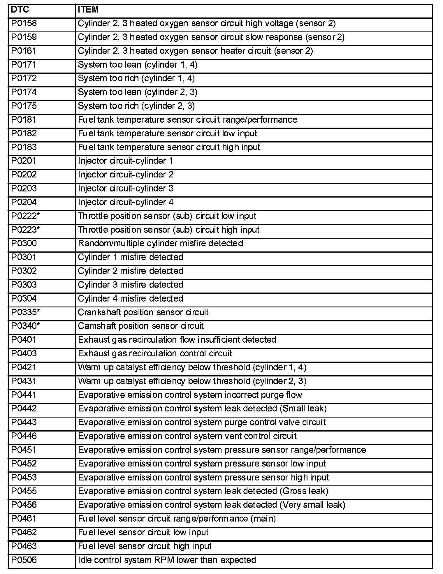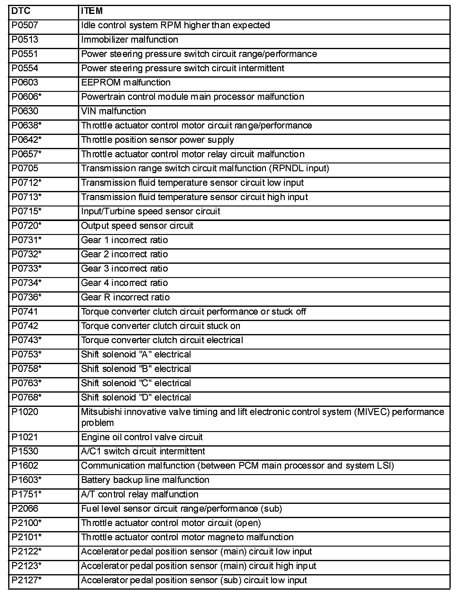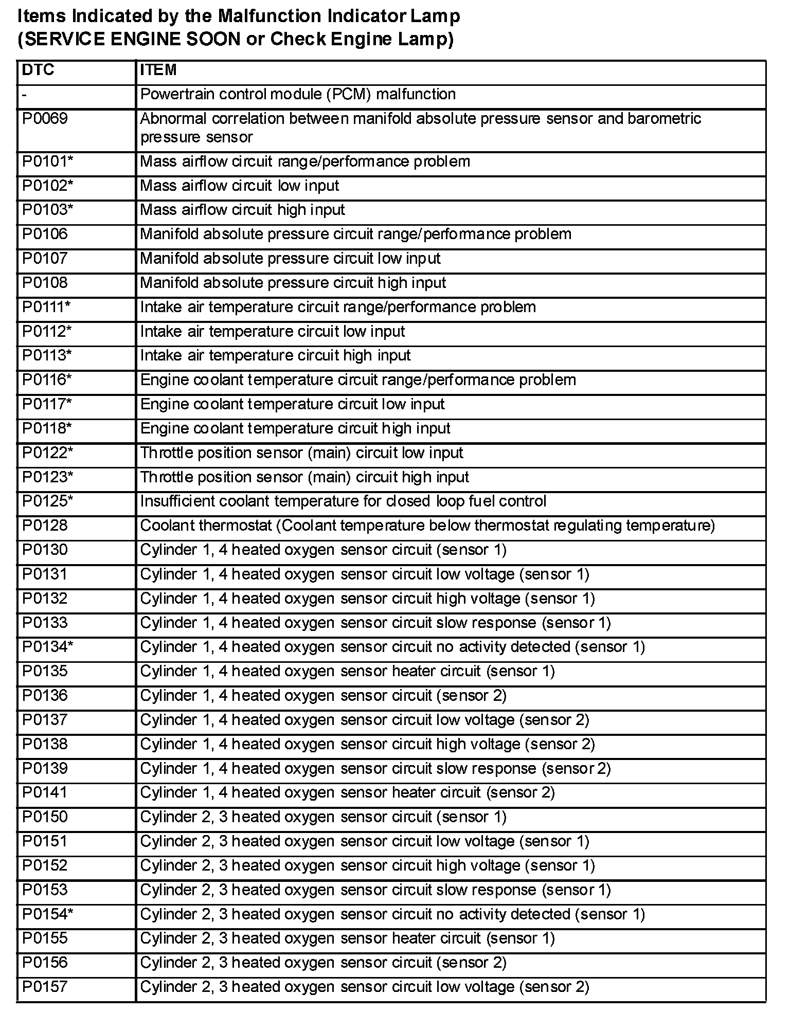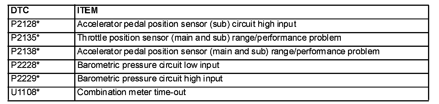 NOTE: After the PCM has detected a malfunction, the Malfunction Indicator Lamp (SERVICE ENGINE SOON or Check Engine Lamp) illuminates when the engine is next turned on and the same malfunction is re-detected. However, for items marked with a "*" in the DTC NO. column, the Malfunction Indicator Lamp (SERVICE ENGINE SOON or Check Engine Lamp) illuminates only on the first detection of the malfunction.