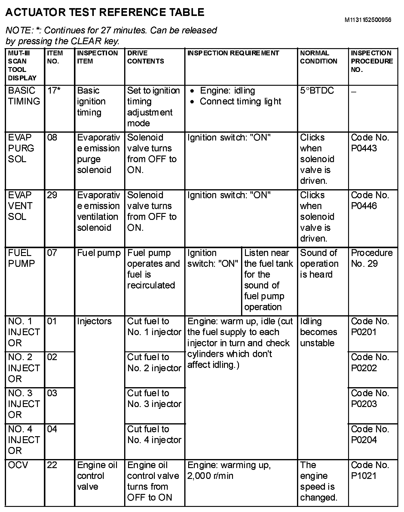 Actuator Test Reference Table