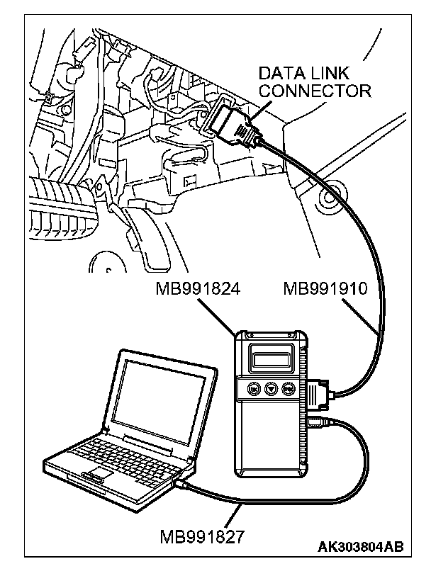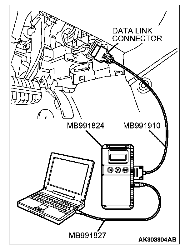 CAUTION: To prevent damage to scan tool MB991958, always turn the ignition switch to the "LOCK" (OFF) position before connecting or disconnecting scan tool MB991958.