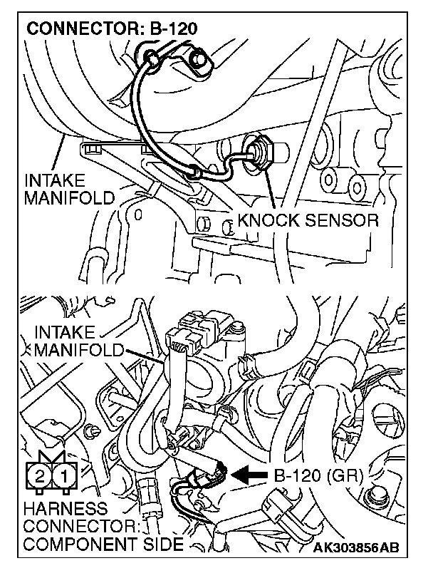 1. The ignition timing should retard more when knock sensor connector B-120 is disconnected than when it is connected.