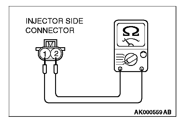 2. Measure the resistance between each injector side connector terminal No. 1 and No. 2.