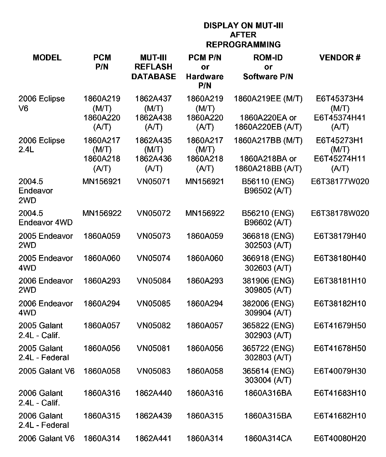 3.Using the MUT-III, verify that the vehicle's PCM part number is listed in the table in Step 10. If it is the same as or higher than the ROM ID or Software P/N in the table, the PCM has already been reprogrammed for this concern.