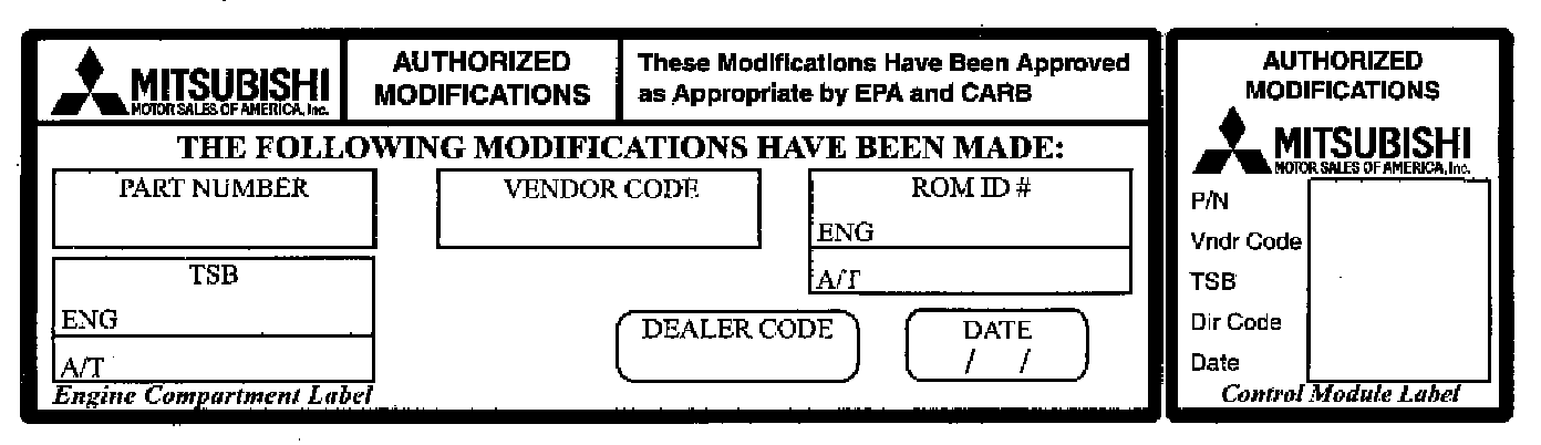 12.Using a ball-point pen, enter the appropriate PCM part number, vendor number, ROM ID, this TSB number (TSB-05-13-010), your dealer code, and the current date on the Engine Compartment and Control Module Label (part no. MSSF-024G-00).