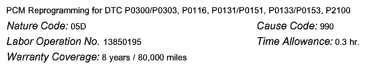 SUBJECT : PCM REPROGRAMMING FOR DTC P0300/P0303, P0116, P0131/P0151, P0133/P0153, AND P2100