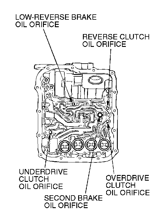 2. Blow 108 kPa (15 psi) compressed air into each brake oil orifice and clutch oil orifice of the transaxle case, and check if each brake and each clutch piston move and air pressure is maintained.