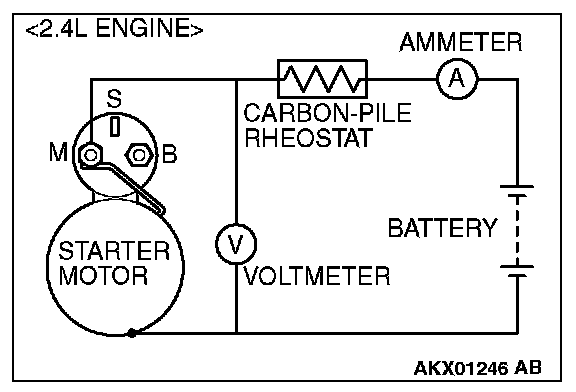 2. Connect a test ammeter (100-ampere scale) and carbon pile rheostat in series between the positive battery terminal and starter motor terminal.