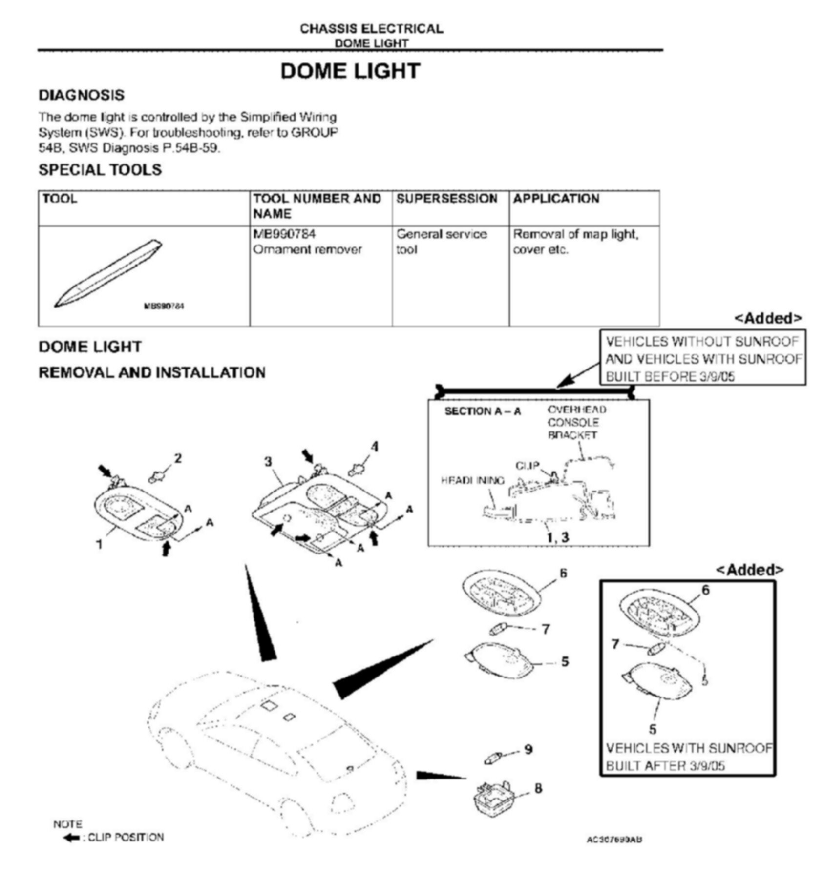 DOME LIGHT MOUNTING - SERVICE MANUAL REVISION