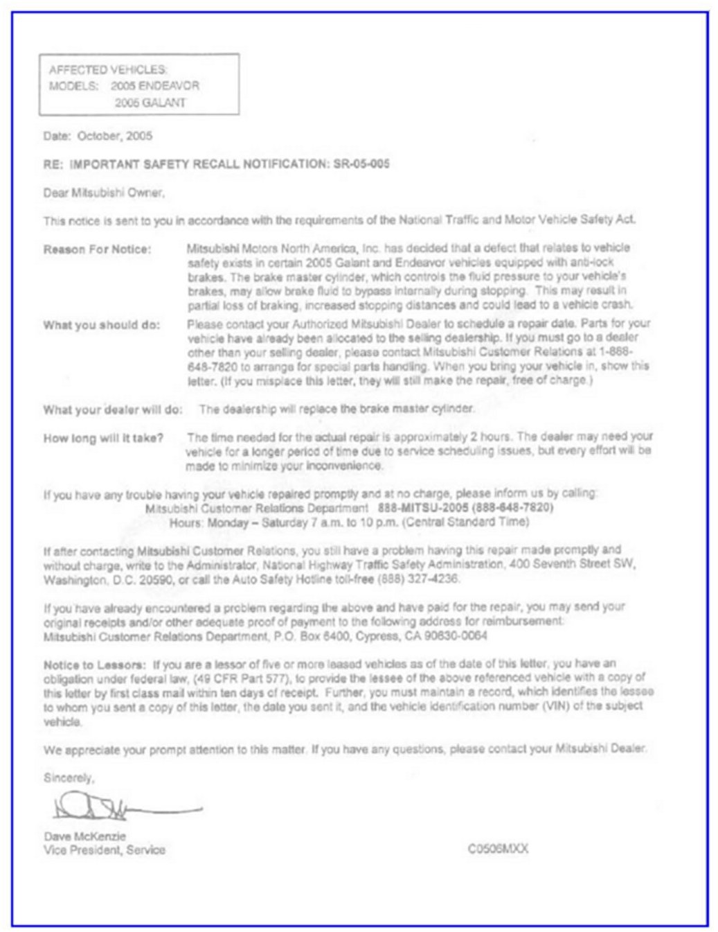 A letter will be sent to all owners of affected vehicles, asking them to bring their vehicle to their selling Mitsubishi Motors dealer to have the brake master cylinder replaced. A copy of the customer notification letter appears later in this bulletin. Dealers are also asked to contact their customers (by phone, e-mail, or fax), asking them to bring their vehicle to the dealership for this repair.