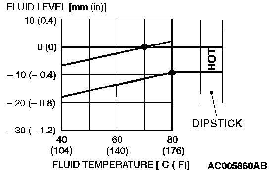 NOTE: If it takes some amount of time until the transmission fluid reaches its normal operating temperature [70 - 80°C (158 - 176°F)], check the transmission fluid level by referring to the left.