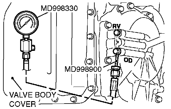 3. Connect the special tools (3.0 MPa (427 psi) oil pressure gauge [MD998330] and adapters [MD998332, MD998900]) to each pressure discharge port.