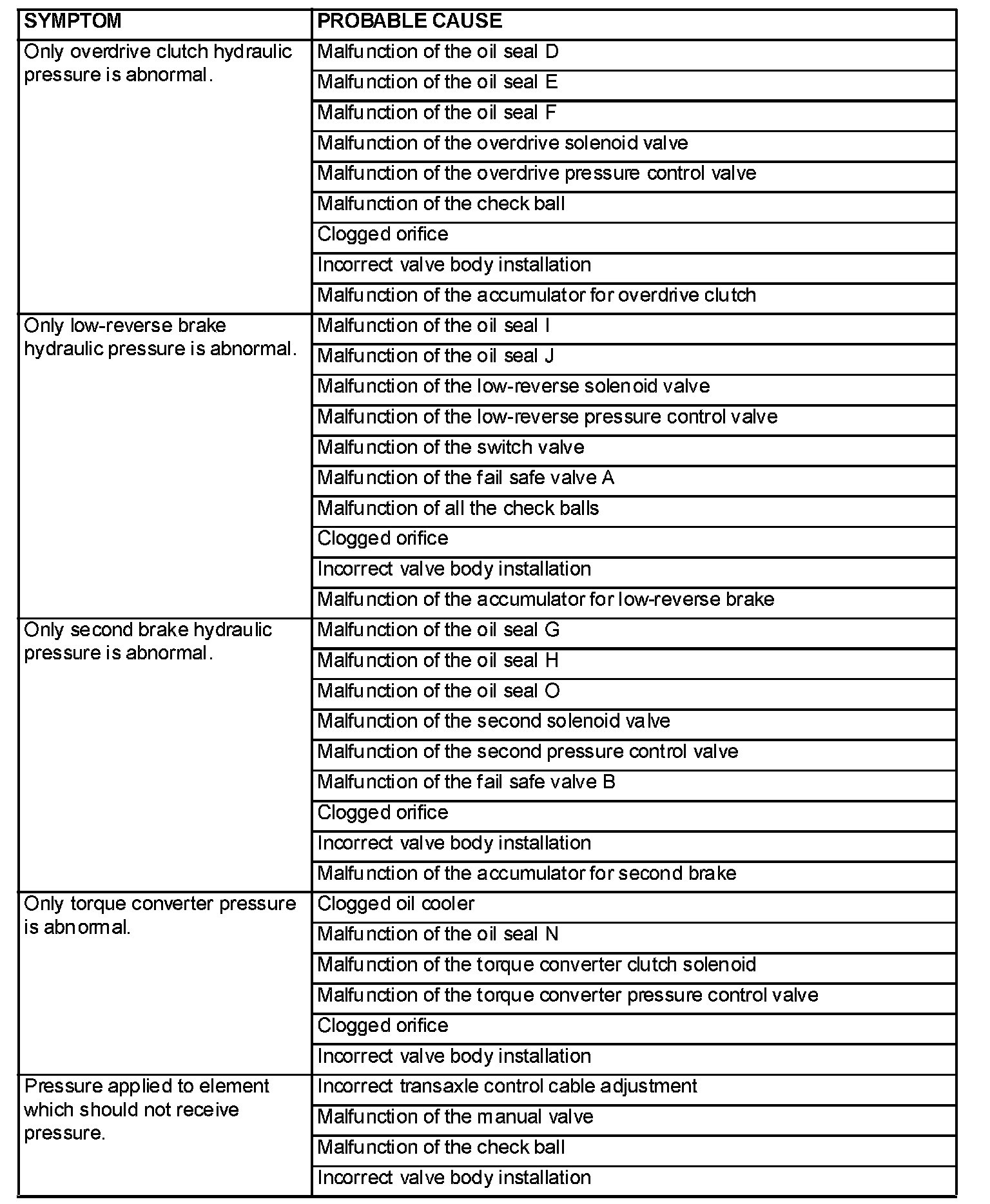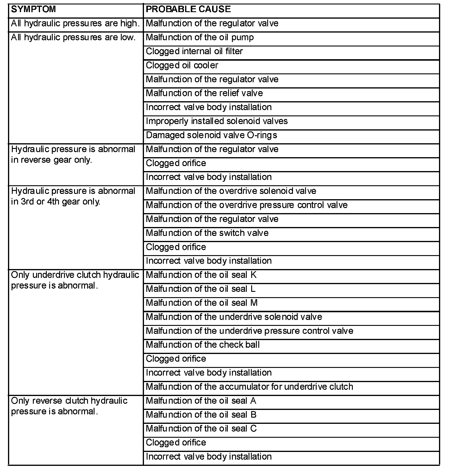HYDRAULIC PRESSURE TEST DIAGNOSIS TABLE