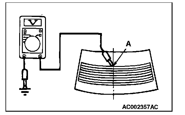 2. Turn "ON" the rear window defogger switch. Measure the heater element voltage with an ohmmeter at the rear window glass center A. Condition is good if it indicates about 6 V.