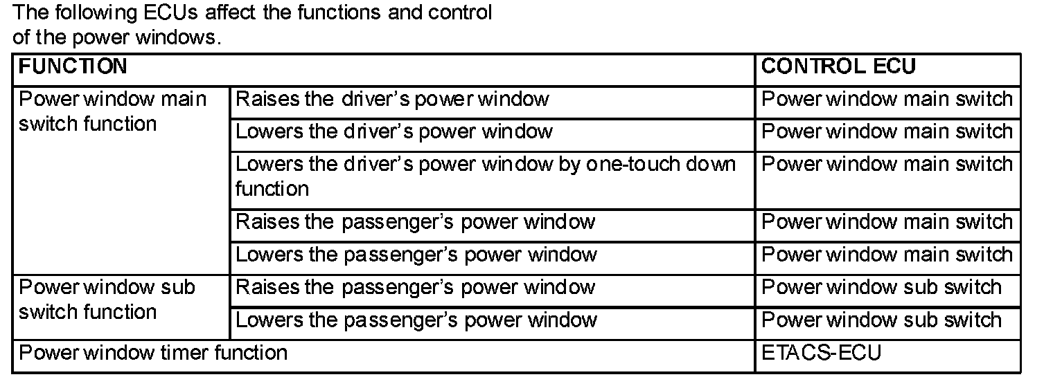 Even after the ignition is switched off, the ETACS-ECU keeps the power window relay activated for approximately 30 seconds, enabling raising and lowering of the power windows by using the power window switches. After approximately 30 seconds, the power window relay is deactivated.