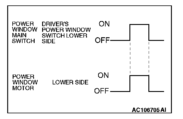 When the driver's power window switch on the power window main switch is pushed down fully, the system energizes its respective power window motor, and then the driver's window glass moves to its lowest position.