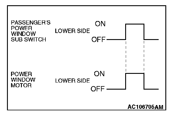 When the passenger's power window switch on the power window main switch is pushed down, the system energizes its respective power window motor, and then the passenger's window glass lowers.