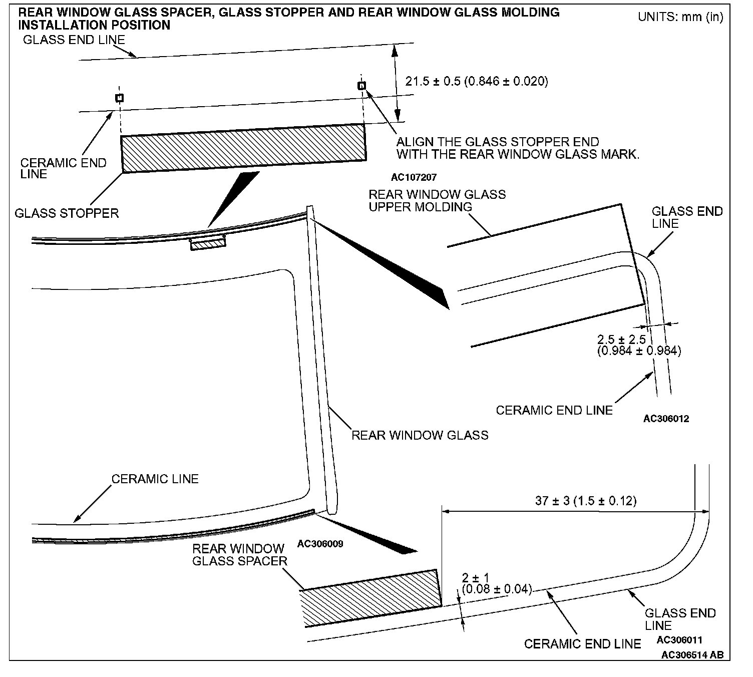 2. Install the rear window spacer and glass stopper to the specified positions so that there are no adrift or bent surfaces inside the rear window glass.