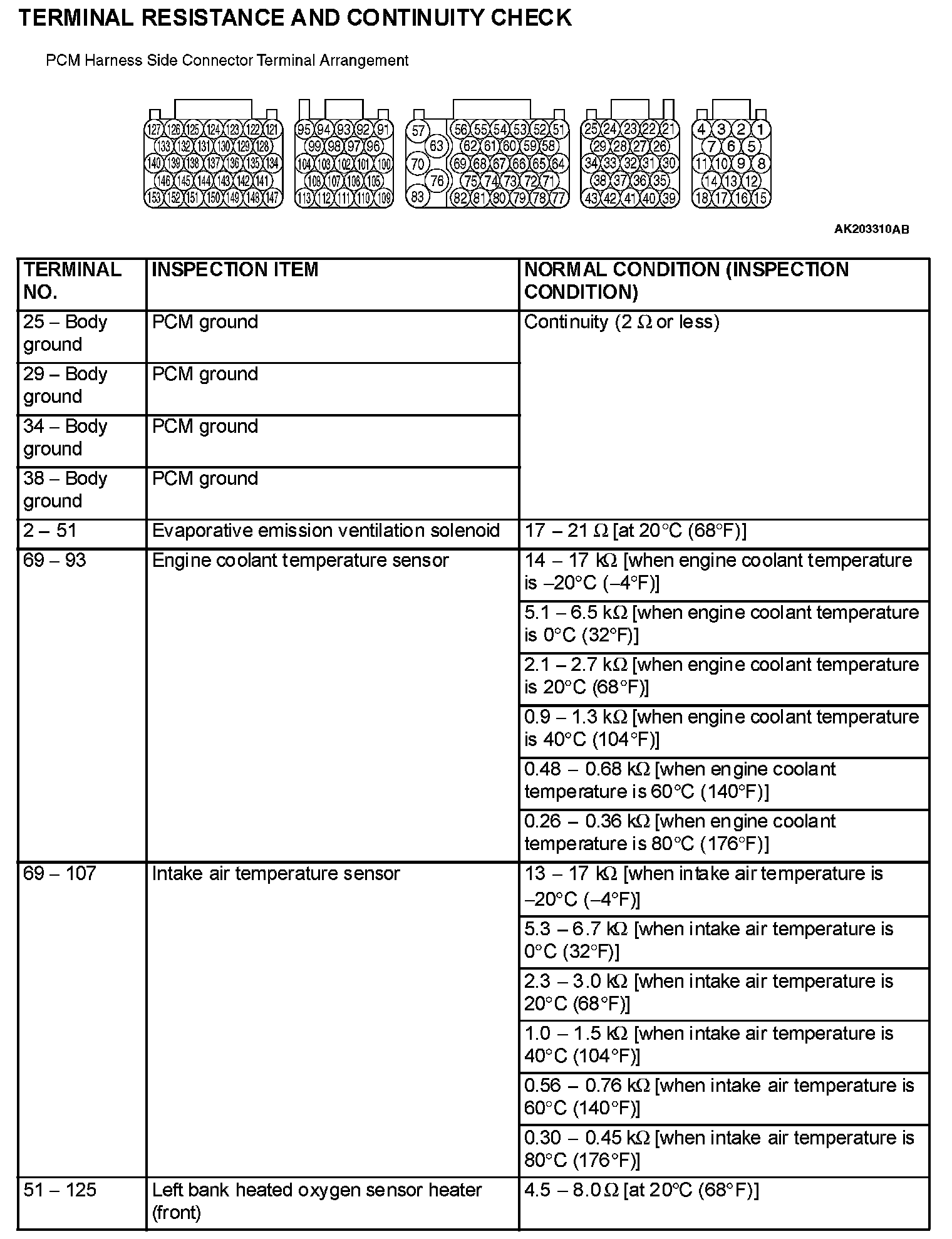 PCM Harness Side Connector Terminal Arrangement Part 1: