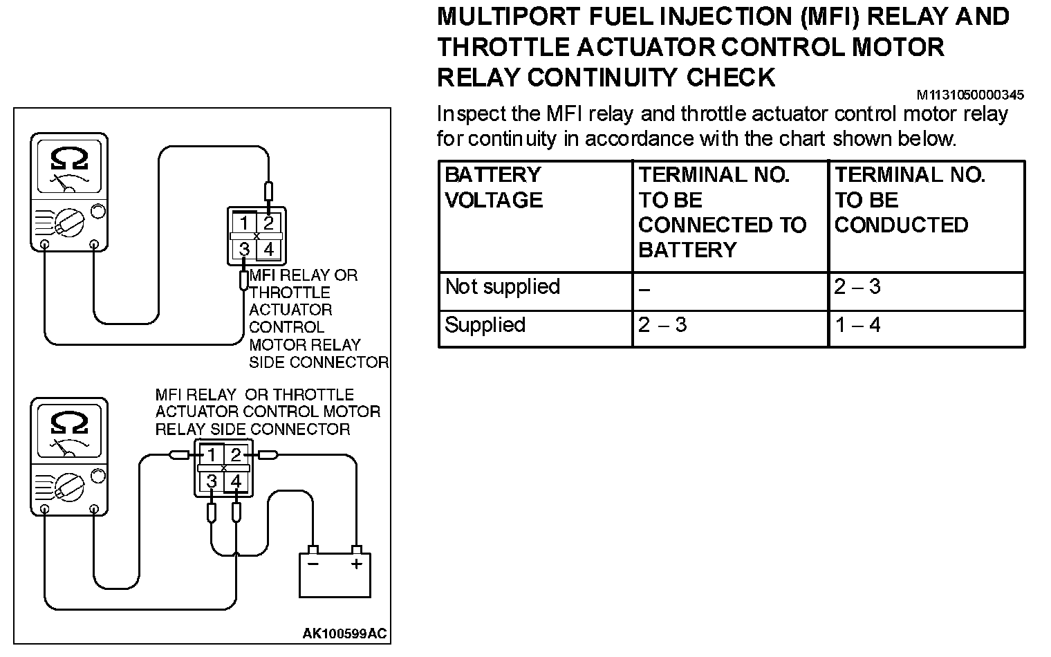 Multiport Fuel Injection (MFI) Relay And Throttle Actuator Control Motor Relay Continuity Check:
