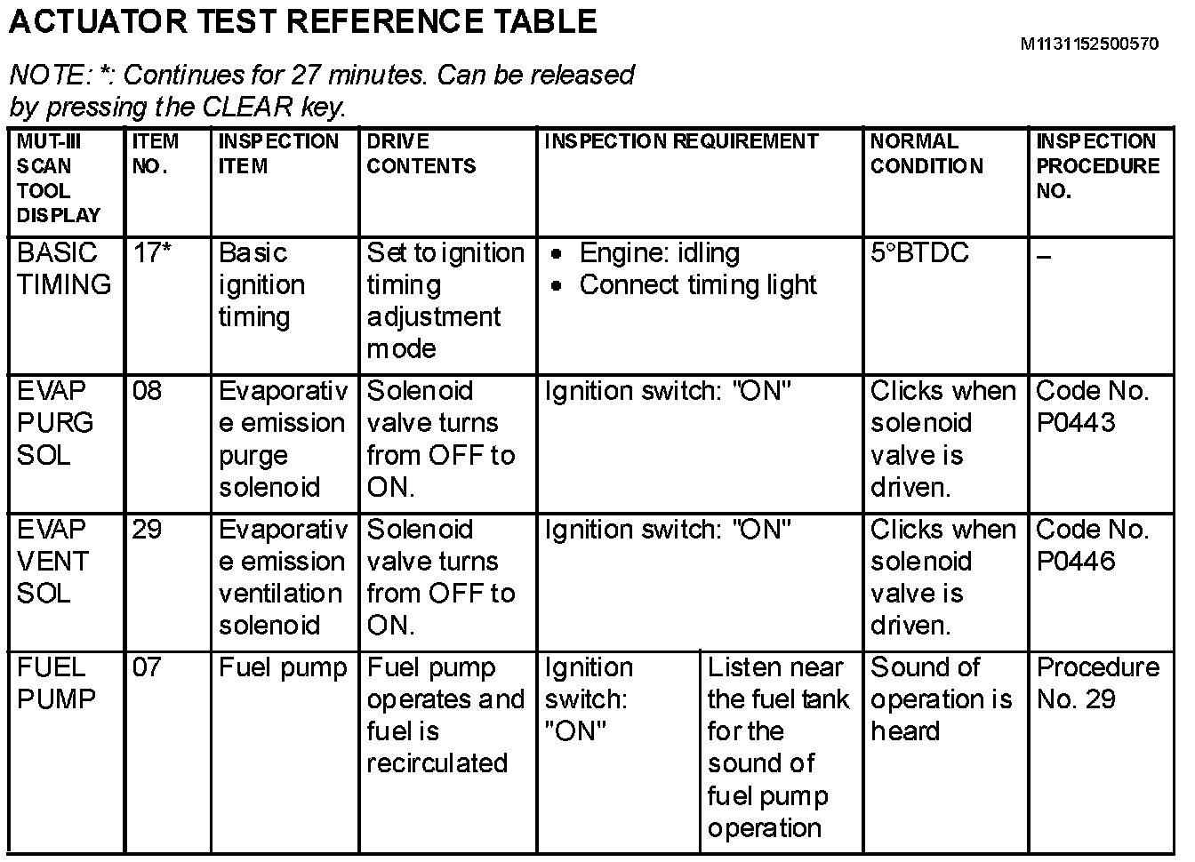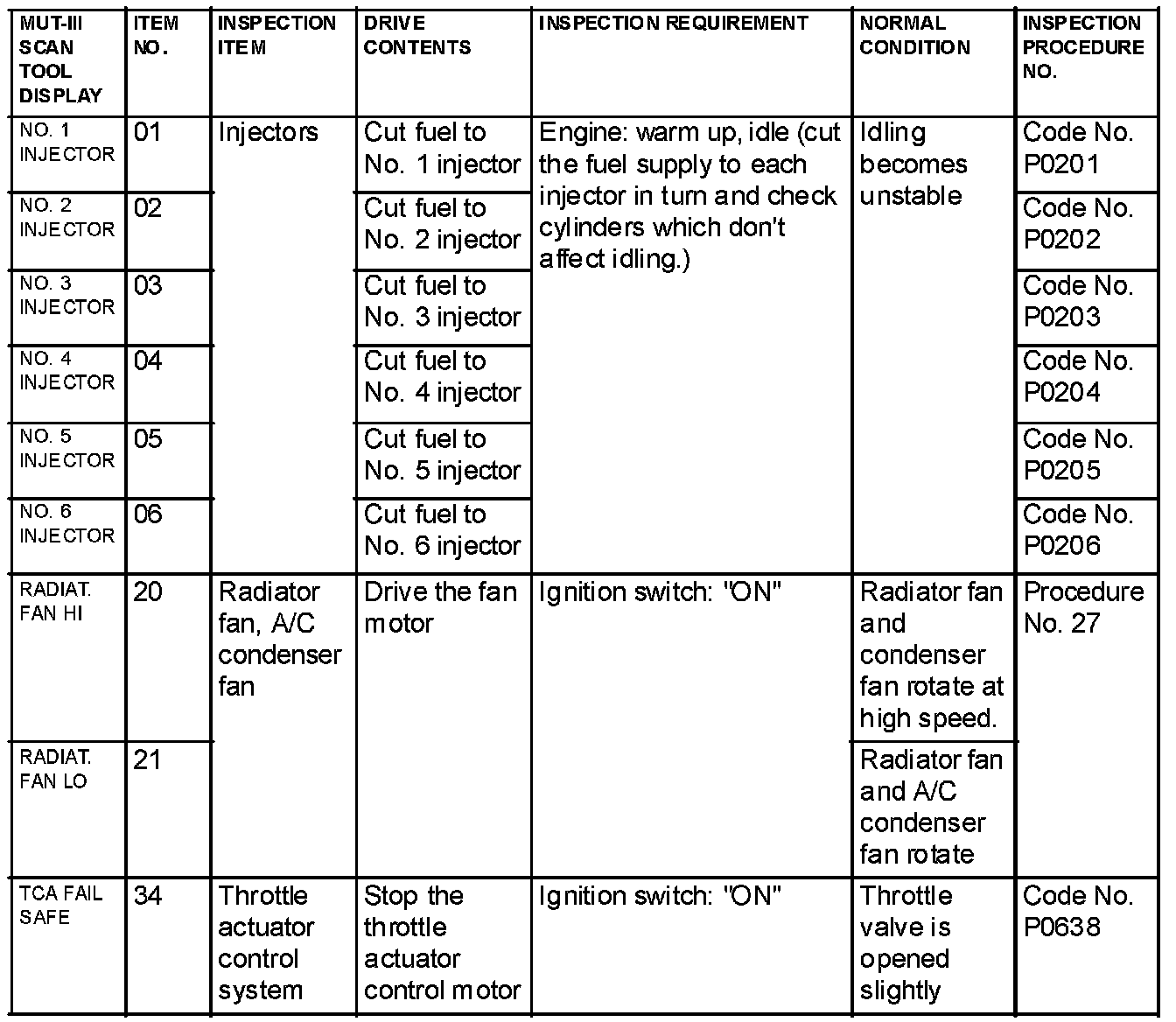 Actuator Test Reference Table