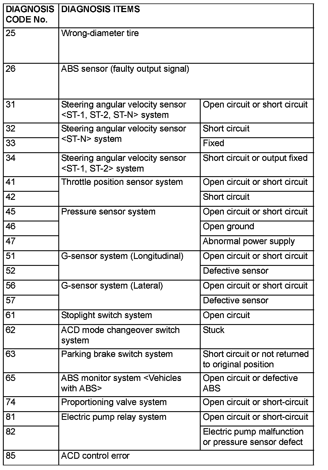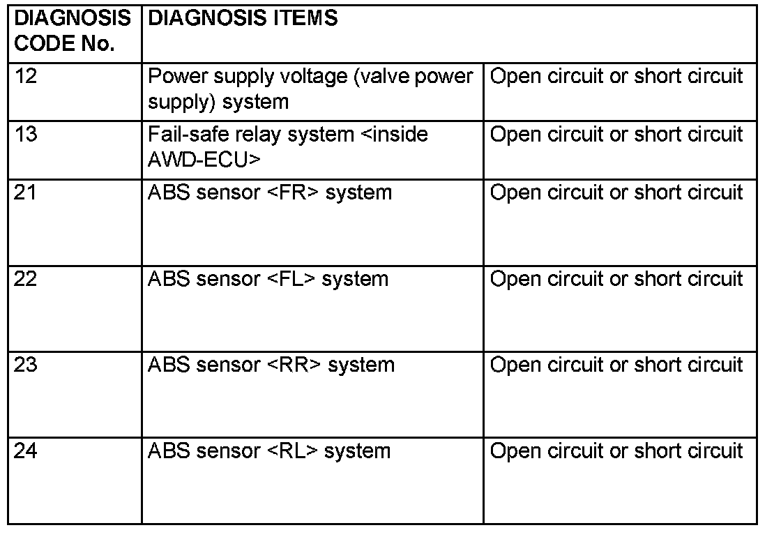 DIAGNOSTIC TROUBLE CODE CHARTNOTE: CODE No. 85 is not a code number output due to malfunction, but a code number output when control for the AWD-ECU to protect the ACD is stopped in excessive driving. ACD control can be recovered by turning the ignition switch ON to OFF to ON.