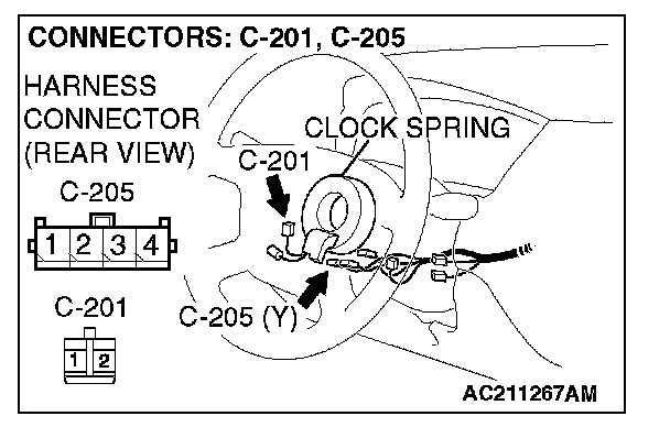 STEP 3. Check SRS-ECU connector C-12, clock spring connector C-205 and driver's air bag module connector C-201 (Using scan tool MB991958, read the diagnostic trouble code).