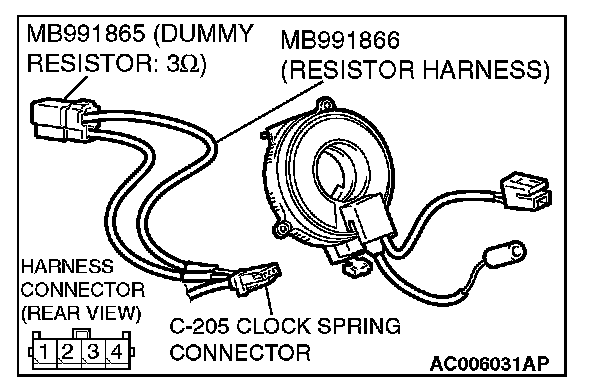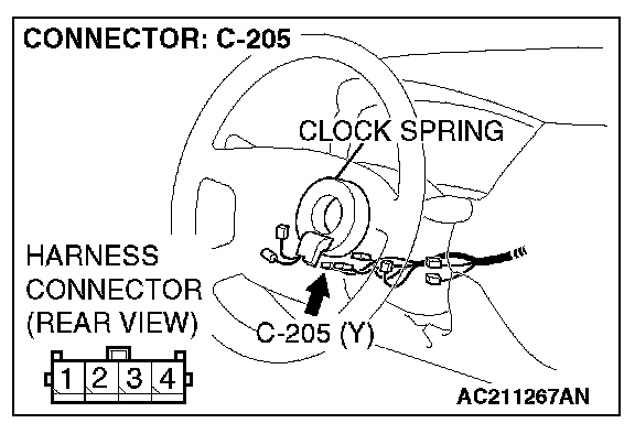 4. Insert special tool MB991866 into clock spring harness side connector C-205 (terminal No.3 and 4) by backprobing.