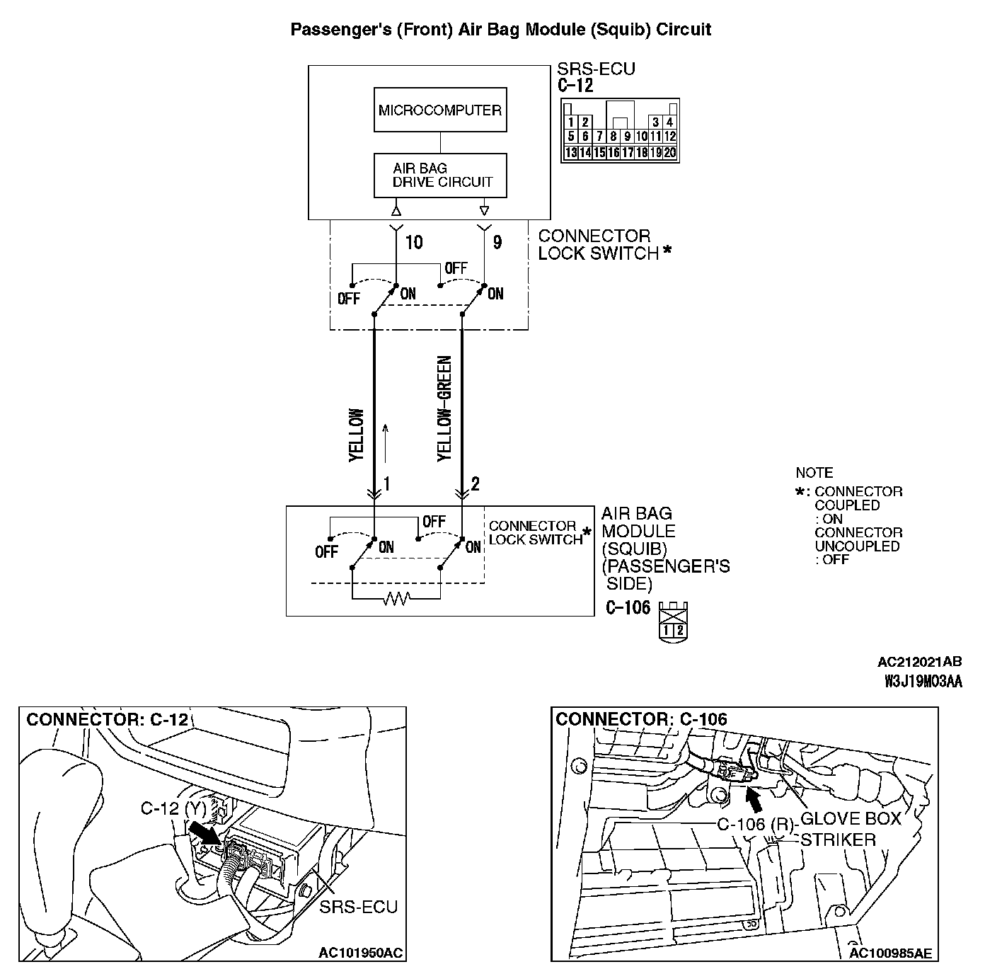 NOTE: *: The squib circuit connectors integrate a "short" spring (which prevents the air bag from deploying unintentionally due to static electricity by shorting the positive wire to the ground wire in the squib circuit when the connectors are disconnected). Therefore, if connector C-12 or C-106 is damaged or improperly engaged, the short spring may not be released when the connector is connected.