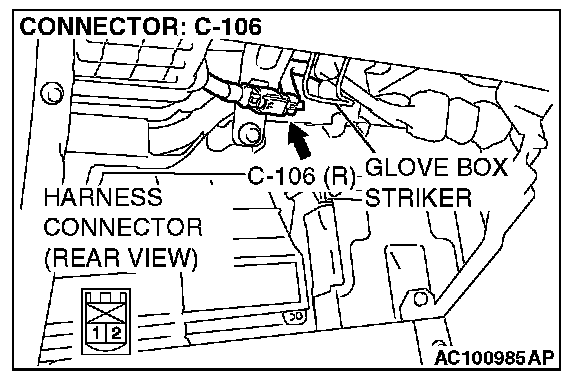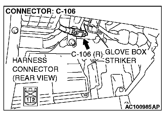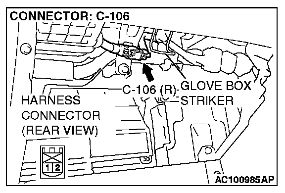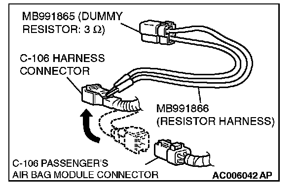 4. Disconnect the passenger's air bag module connector C-106, and insert special tool MB991866 into the harness connector by backprobing