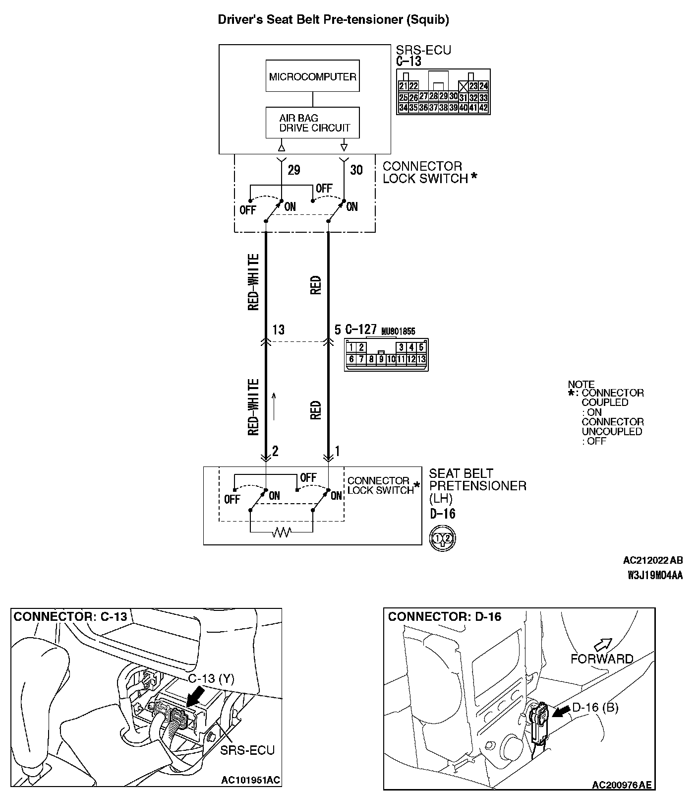 1. Disconnect SRS-ECU connector C-13 and driver's seat belt pre-tensioner connector D-16, and measure at the wiring harness side. For connector D-16, use a flat-tipped screwdriver to unlock the locking button at the harness side connector by withdrawing it toward you in two stages, and then disconnect the connector.