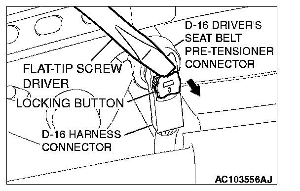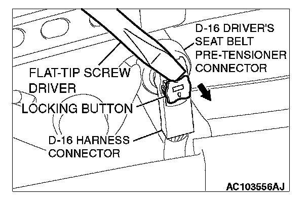 2. Disconnect the driver's seat belt pre-tensioner connector D-16. Use a flat-tipped screwdriver to unlock the locking button at the harness side connector by withdrawing it toward you in two stages, and then disconnect the connector.