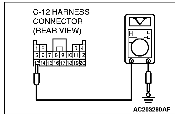 5. Measure the voltage between C-12 harness connector terminal 13 and body ground.