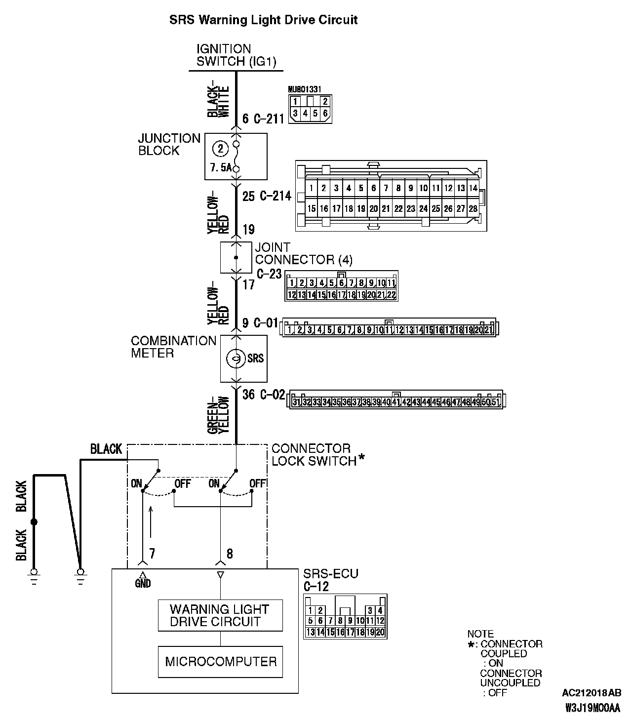 DTC 43: SRS Warning Light Drive Circuit System Fault 1 (Light does not Switch Off.)SRS Warning Light Drive Circuit Part 1: