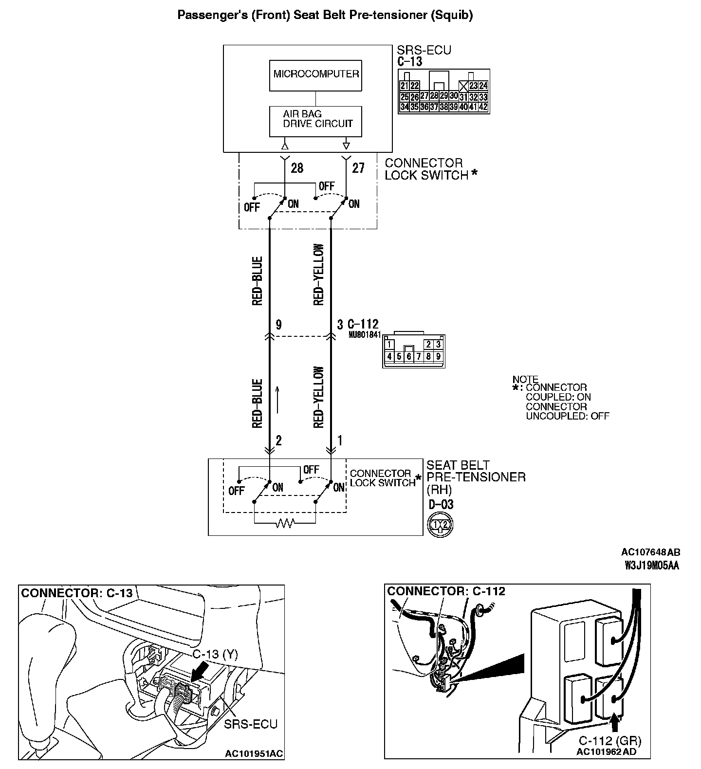 STEP 2. Check the passenger's seat belt pre-tensioner circuit at the SRS-ECU connector C-13.