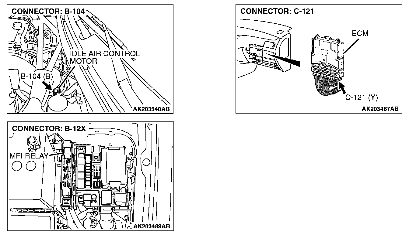 STEP 9. Check for open circuit and short circuit to ground between idle air control motor connector B-104 and ECM connector C-121.