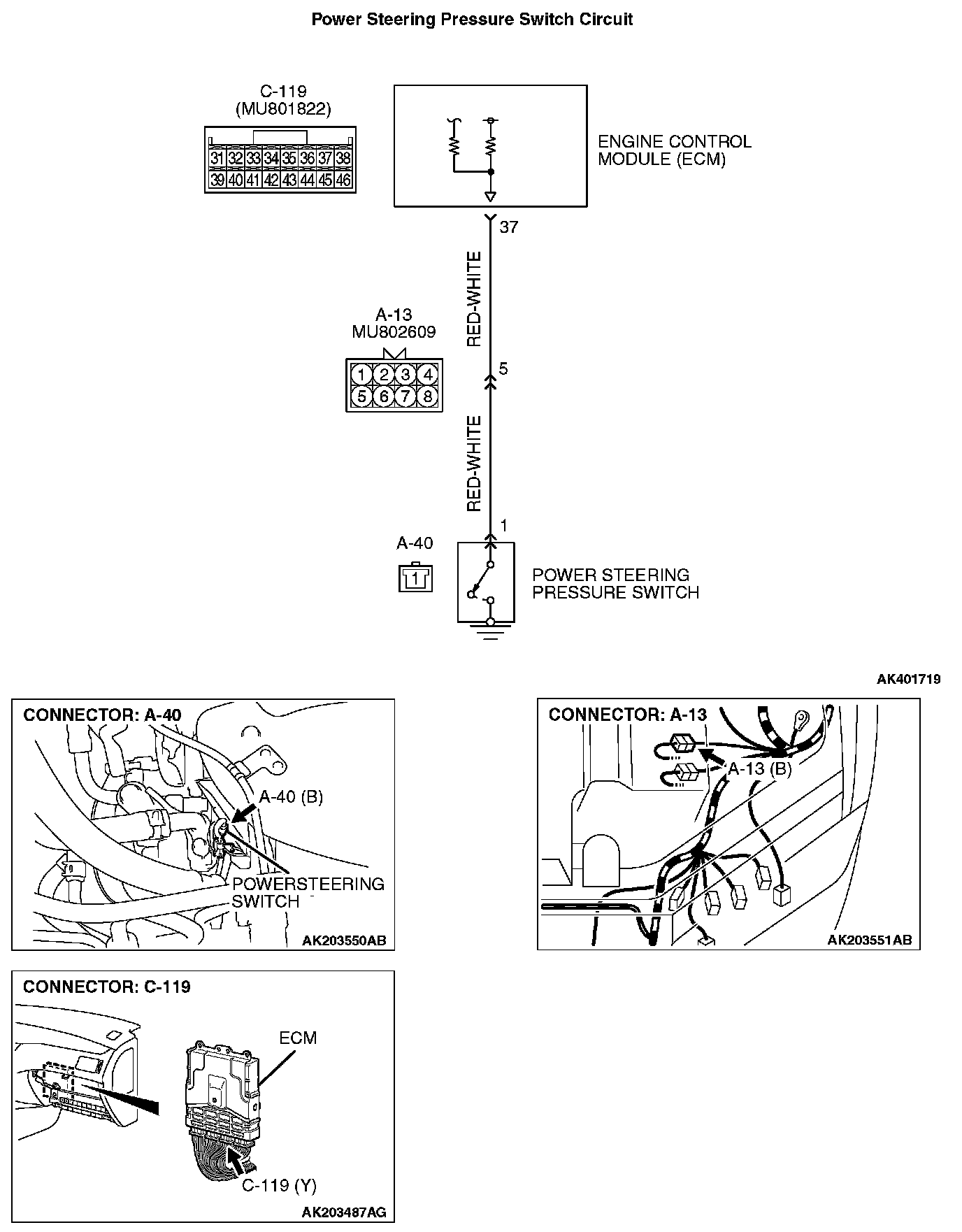 STEP 13. Check for harness damage between power steering pressure switch connector A-40 (terminal No.1) and ECM connector C-119 (terminal No.37).