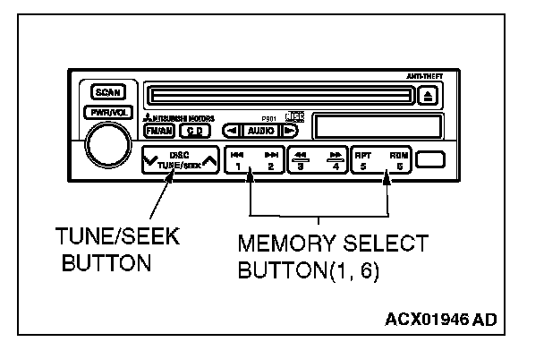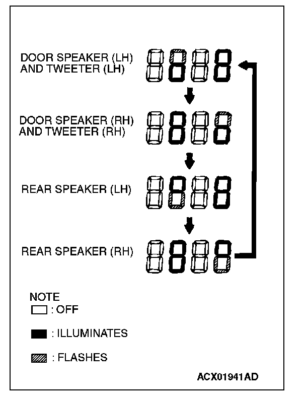 4. If a button other than the memory select "6" button and "EJECT" button is pressed, or the ignition switch is turned to "LOCK" (OFF) position, you will exit from the speaker test mode.