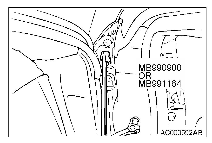 1. Use special tool MB990900 or MB991164 to loosen the hinge mounting bolts on the body side and then adjust the clearance around the door so that it is uniform on all sides.
