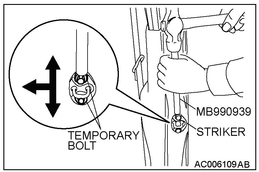 Install an appropriate bolt instead of the striker mounting bolt and use special tool MB990939 and a hammer to tap the bolt to the desired direction.
