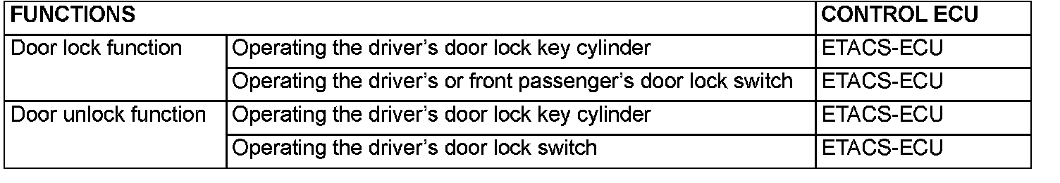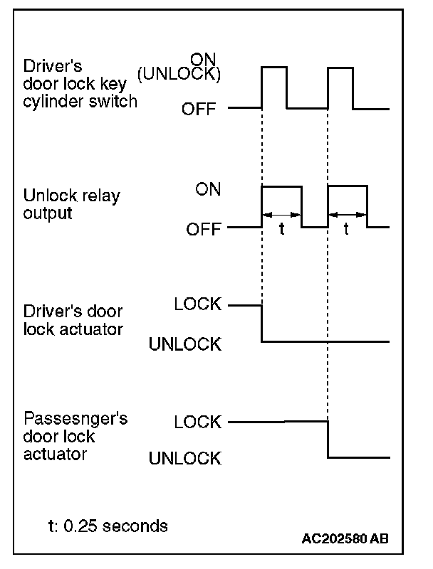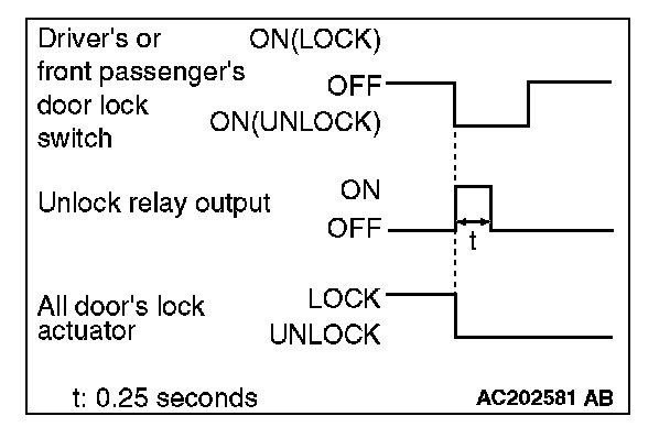 When the door is unlocked by driver's or front passenger's door lock switch, the ETACS-ECU energizes its door unlock relay for 0.25 second to activate all the door lock actuators. Then all the doors will be unlocked.