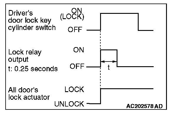 When you insert the ignition key to the driver's door lock key cylinder and turn the key clockwise to lock the door, the ETACS-ECU energizes its door lock relay for 0.25 second to activate all the door lock actuators. Then all the doors will be locked.